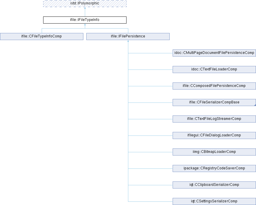 Implemented in idoc::CMultiPageDocumentFilePersistenceComp, idoc::CTextFileLoaderComp, ifile::CComposedFilePersistenceComp, ifile::CFileTypeInfoComp, ifile::CTextFileLogStreamerComp, ifilegui::CFileDialogLoaderComp, iimg::CBitmapLoaderComp, ipackage::CRegistryCodeSaverComp, iqt::CClipboardSerializerComp, and iqt::CSettingsSerializerComp.